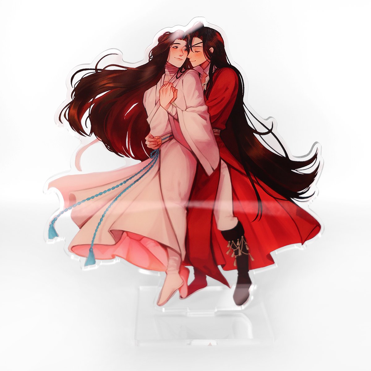 Standee is 165mm x 155mm and comes with the base shown. There is protective film on the design and base so it doesn't get scratched during shipment. You may peel off this film– it won't damage the design.