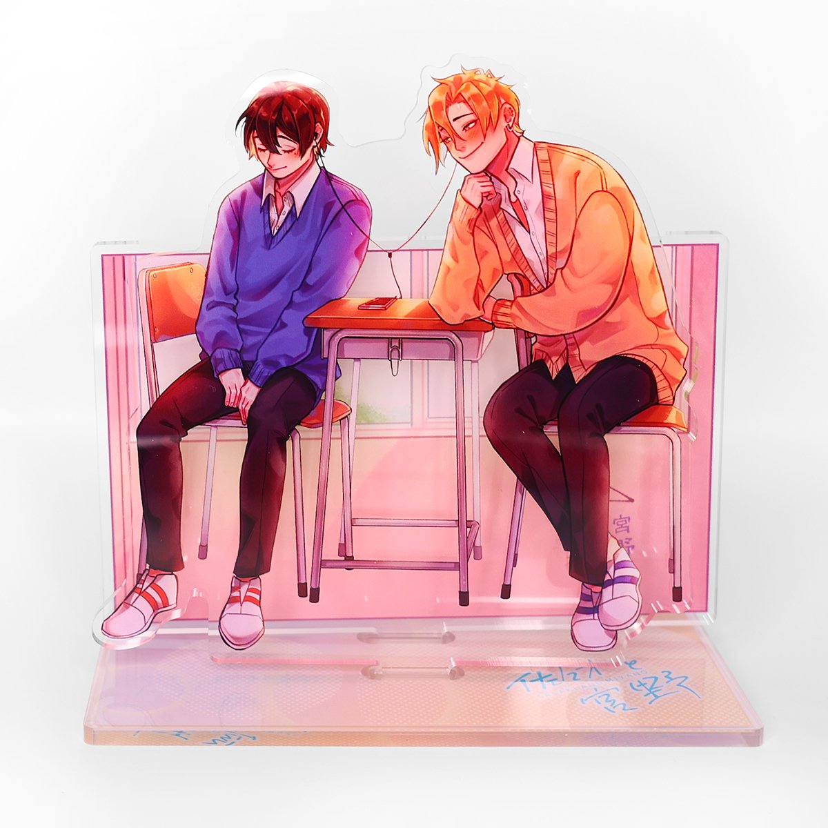 Standee is 127mm x 130mm and comes with two acrylic upright designs (characters on their own stand, and the background behind them) and the base shown.